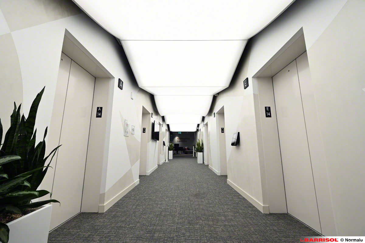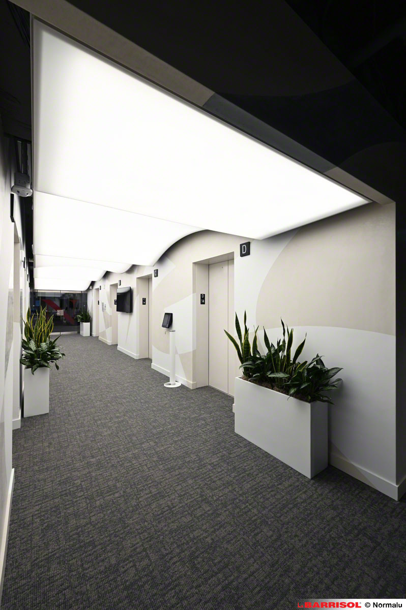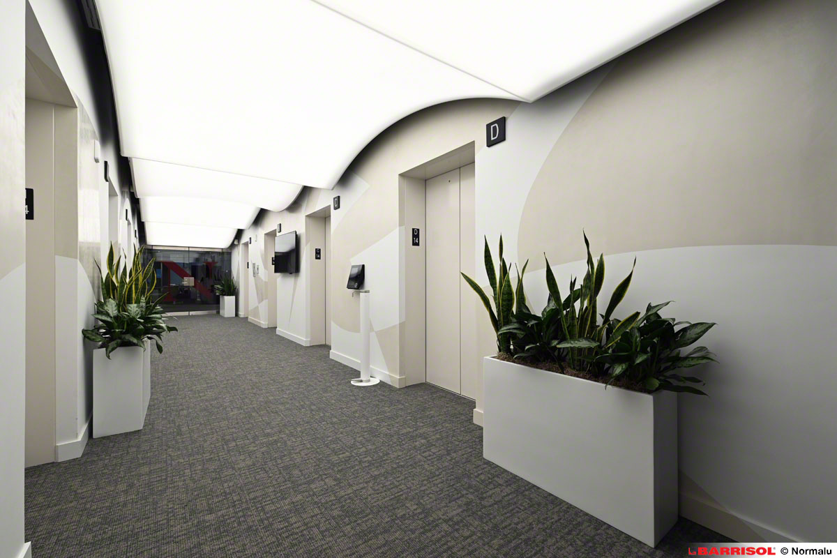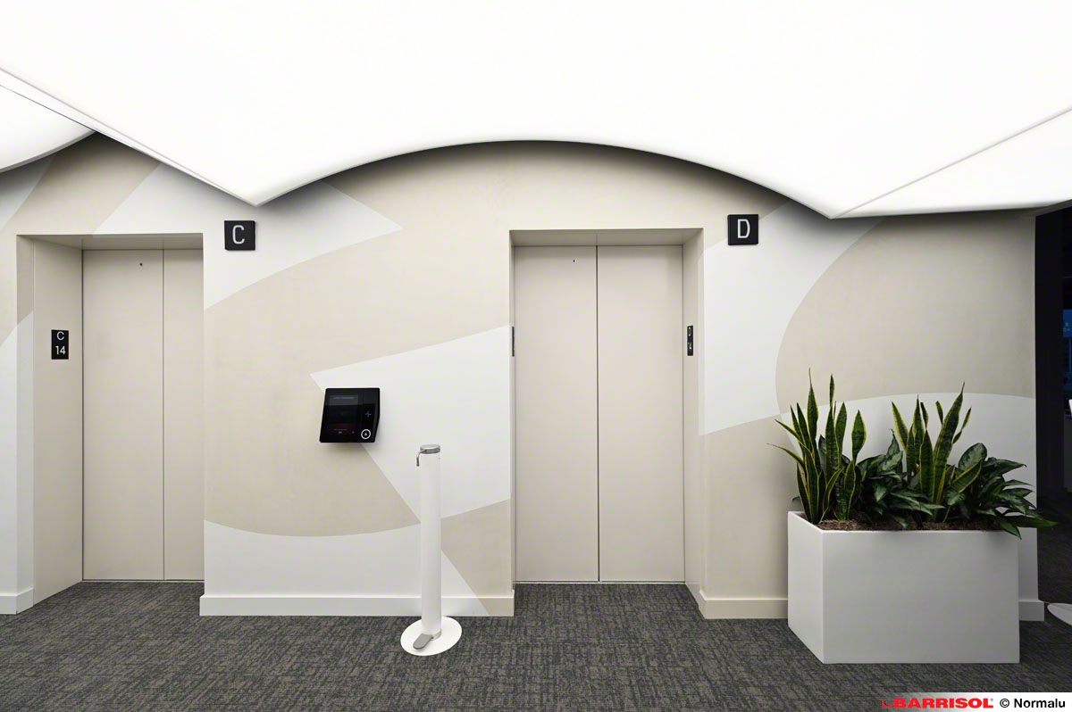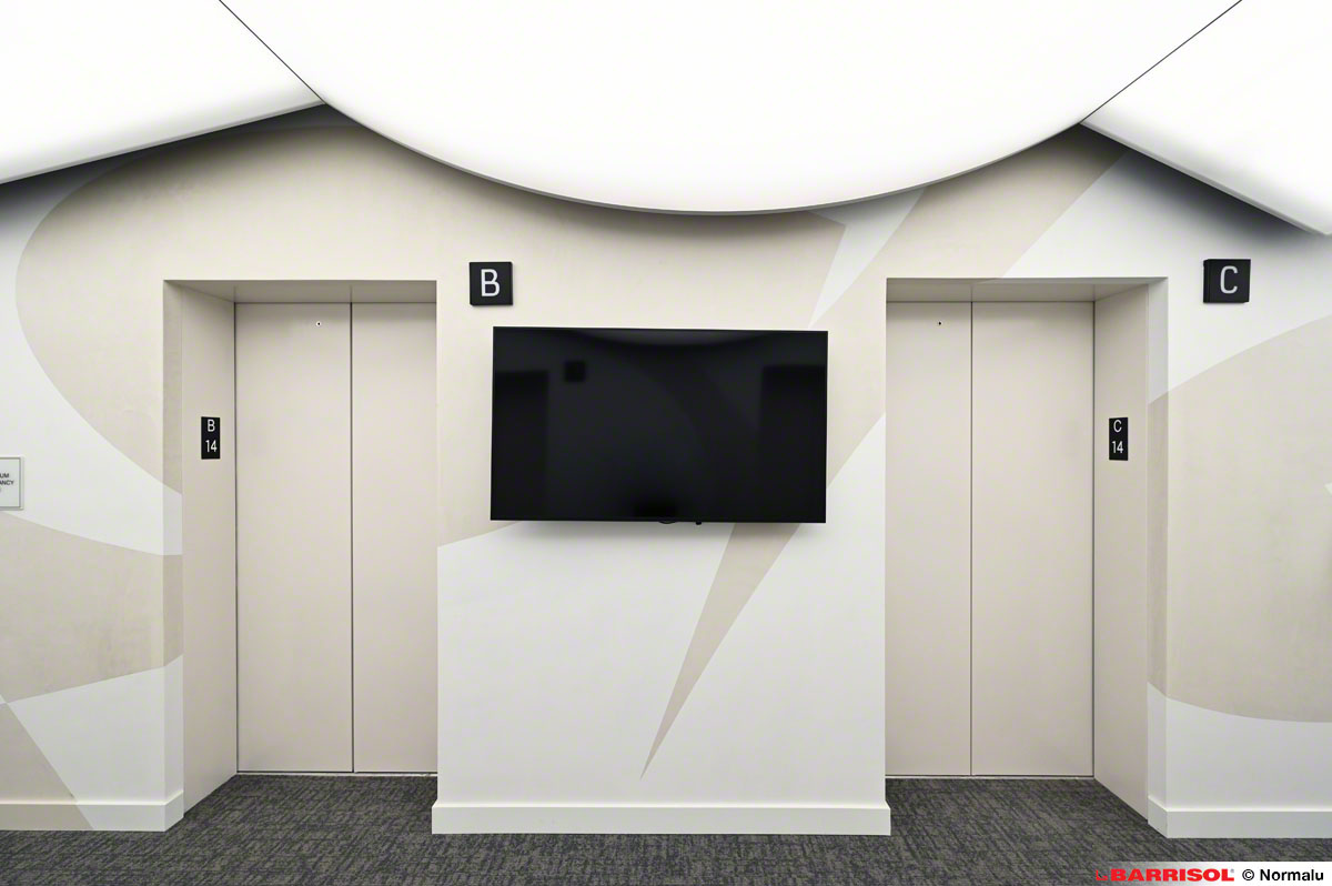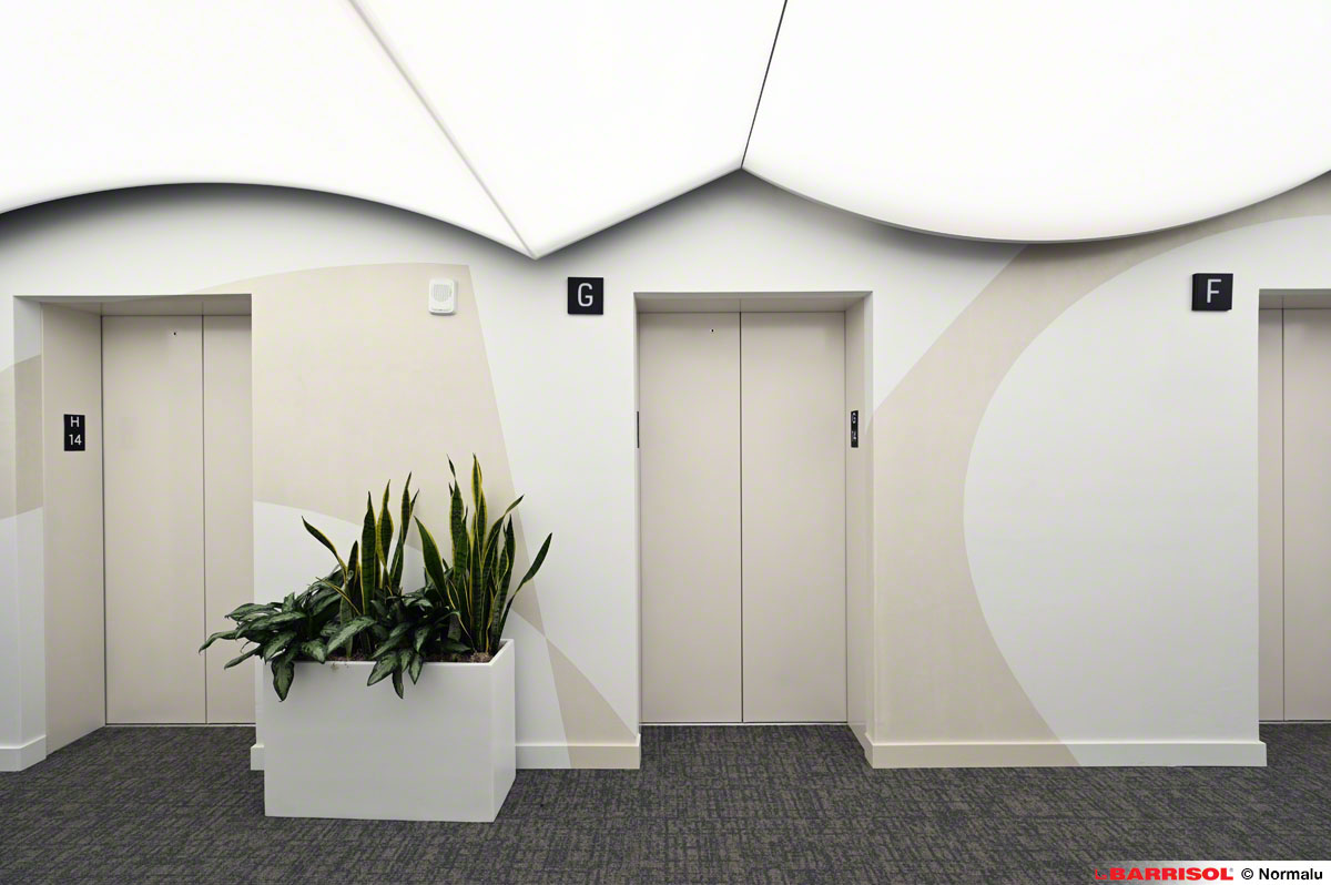 Ce concept original a été répliqué sur plusieurs étages, à la sortie des ascenseurs, offrant ainsi une expérience visuelle cohérente et remarquable dans tout le bâtiment.