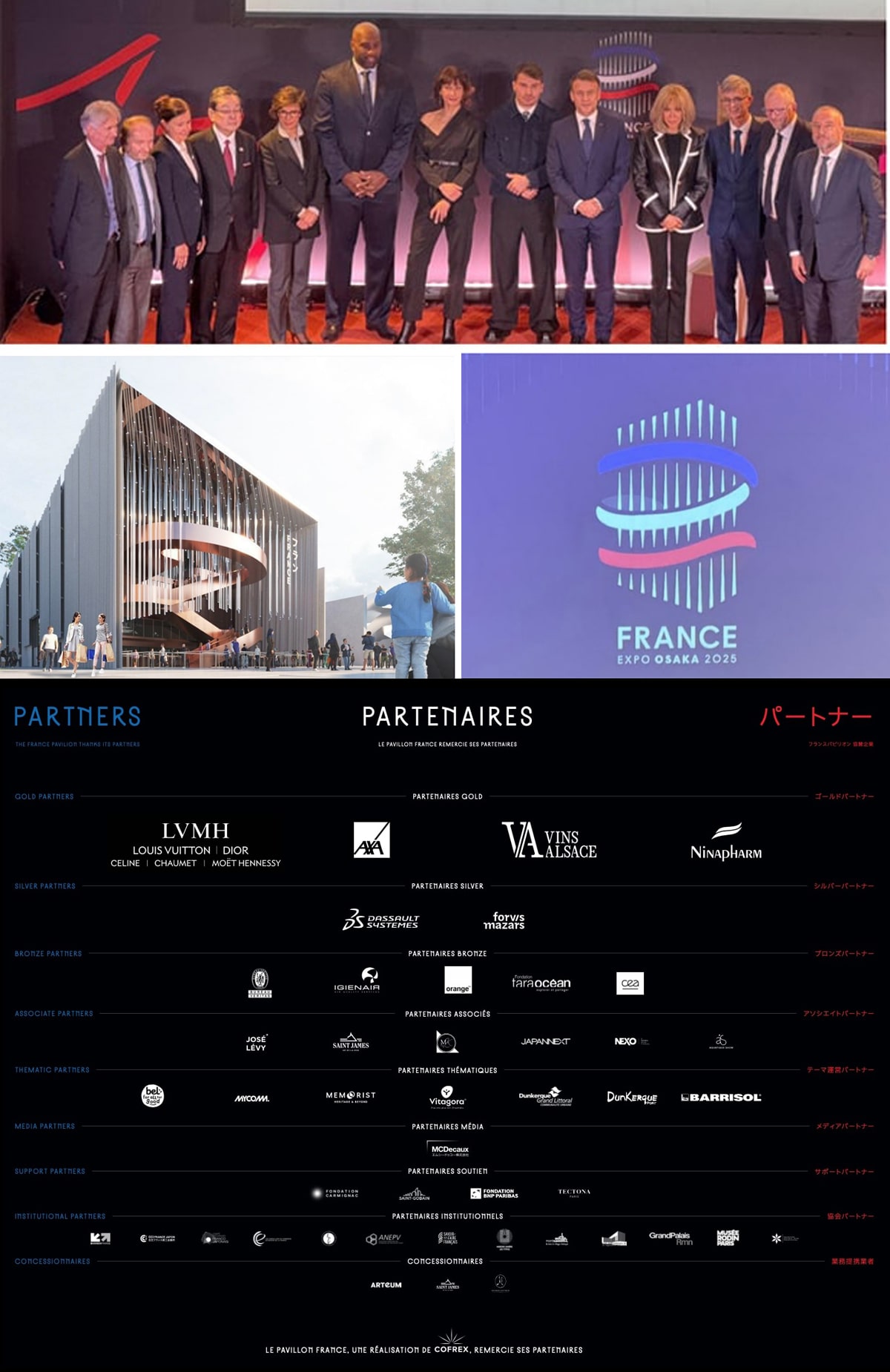 On Tuesday 04 February, at the Cité de l'architecture et du patrimoine, the Pavillon France in Osaka was launched in the presence of President Emmanuel Macron, Mrs Brigitte Macron, Makita Shimokawa, Japanese Ambassador to France, Mrs Rachida Dati, Minister of Culture, Jacques Maire, Director of CoPresident Emmanuel Macron, Mrs Brigitte Macron, Makita Shimokawa, Japan's Ambassador to France, Mrs Rachida Dati, Minister of Culture, Jacques Maire, Director of Cofrex and General Commissioner of the Pavillon France, and the event's sponsors, Antoine Dupont, Sophie Marceau and Teddy Riner. We're proud to have taken part in this event alongside all our partners, including LVMH, Axa, Ninapharm, Dassault, Orange, Céline and Chaumet, as well as Vins d'Alsace and Aquatique Show.